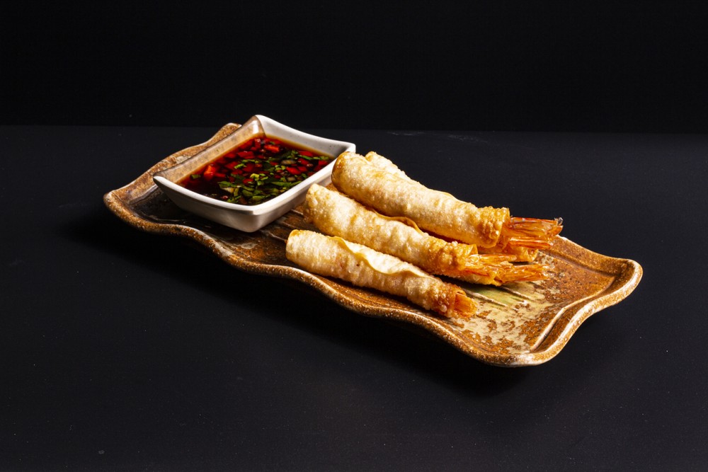 Тигровые креветки в хрустящем тесте, обжаренные во фритюре. Подаются с ароматным соусом