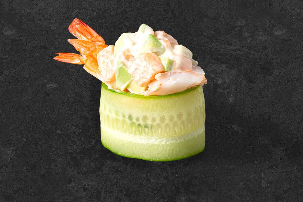 Завернутый в свежий огурец рис с креветкой, сёмгой, авокадо 20/10/8