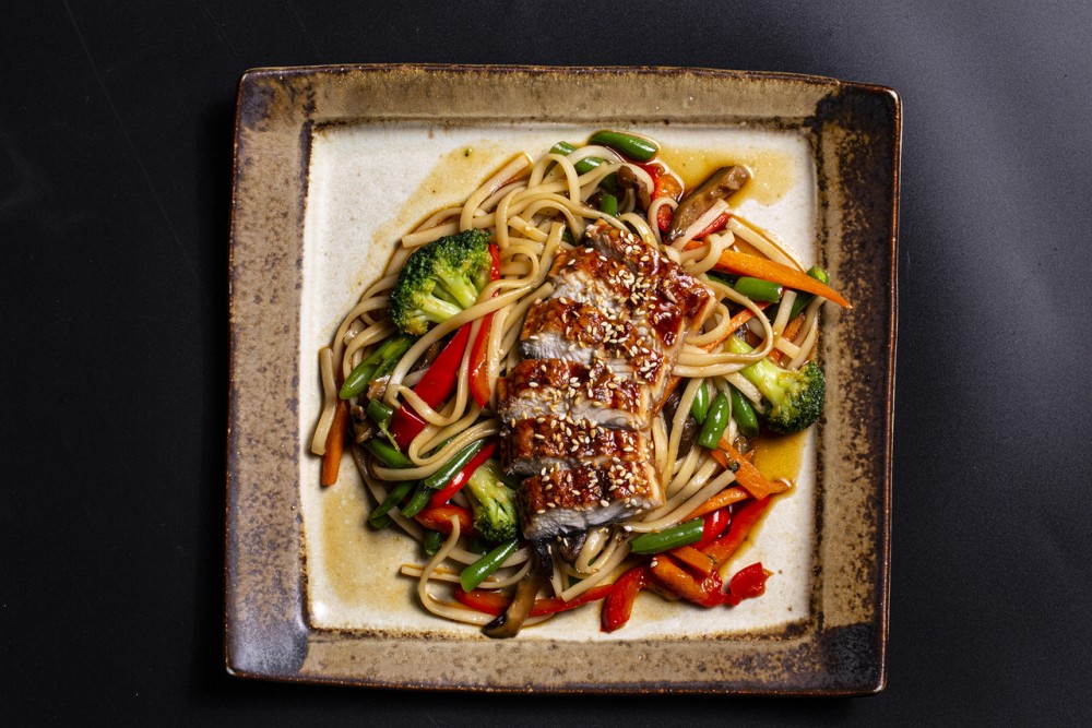 Пшеничная лапша с угрем, овощами, грибами шиитаке в устричном соусе