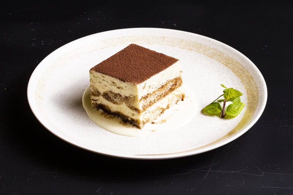 Изысканный десерт из бисквита, сыра Маскарпоне, с ванильным соусом