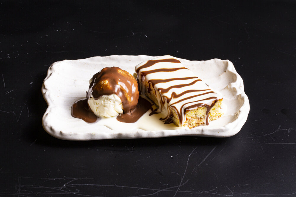 Блинный торт с творожной начинкой, ванильно-шоколадным соусом и мороженым