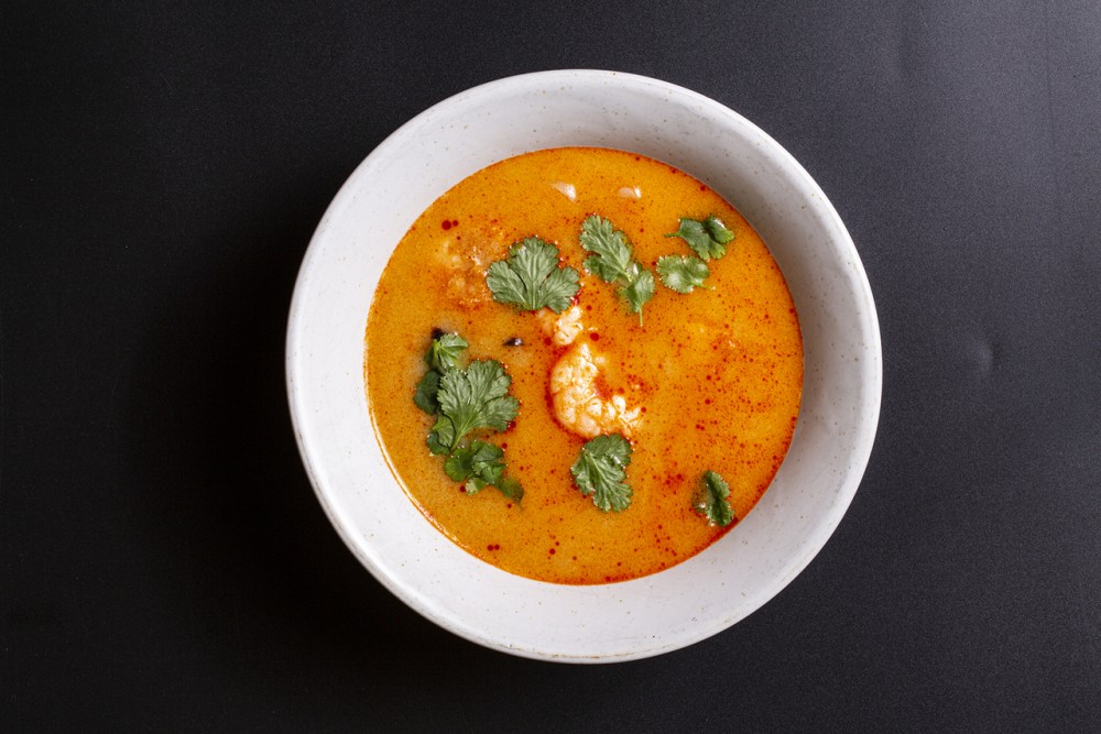 Острый суп на основе куриного бульона и кокосового молока с тигровыми креветками, куриным филе, грибами шиитаке и лапшой харусаме