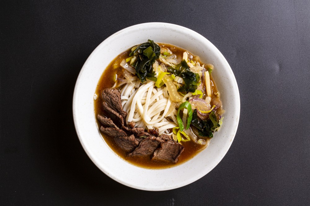 Пшеничная лапша удон в мясном бульоне с маринованным бамбуком, пекинской капустой, морскими водорослями и филе говядины