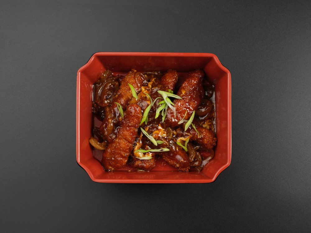 Свинина, панированная и обжаренная во фритюре, с кисло-сладким соусом. Подается с рисом Гохан