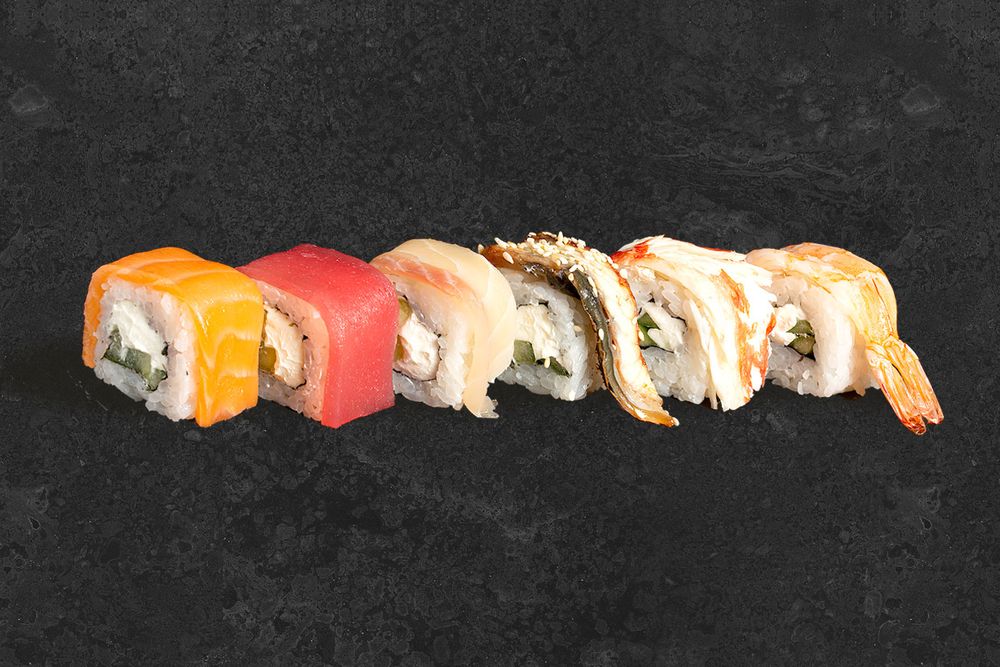 С сёмгой, тунцом, копчёным угрём, мясом краба, тигровой креветкой, коралловым окунем, свежим огурцом и сыром филадельфия