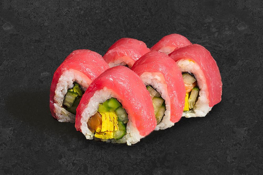 С тунцом, сёмгой, авокадо, японским омлетом тамагояки, свежим огурцом и зелёным луком