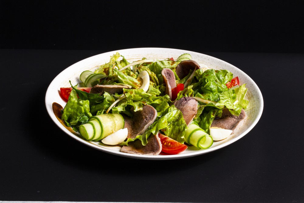 Отварной язык с миксом салатных листьев, перепелиным яйцом, помидорами черри и свежим огурцом заправляется соево-горчичным соусом